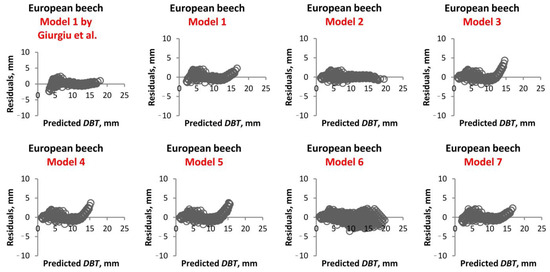 In the case of the European beech species, the optimal point cloud layout for DBT residuals is observed when Model 2 (Figure 4) is applied. This conclusion is corroborated by the analysis of the other accuracy indexes. Conversely, Models 3–5 and Model 7 yield predominantly positive residuals for predicted DBT values exceeding 13 mm, indicating that these predicted DBT values are less than the observed values.