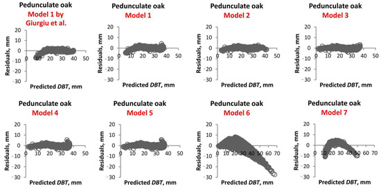 The analysis of the charts included in Figure 5 indicates that for the pedunculate oak species, the optimal DBT residuals are obtained through the application of Model 3, with Model 2 demonstrating a comparable performance. Furthermore, Model 3 was identified as the optimal choice based on the analysis of the R2, MAE, RMSE, AIC, and BIC values. However, Models 6 and 7 were revealed to be unsuitable for estimating DBT values exceeding 45 mm, resulting in negative residuals. This indicates that the predicted DBT values for this range are higher than the observed DBT values.