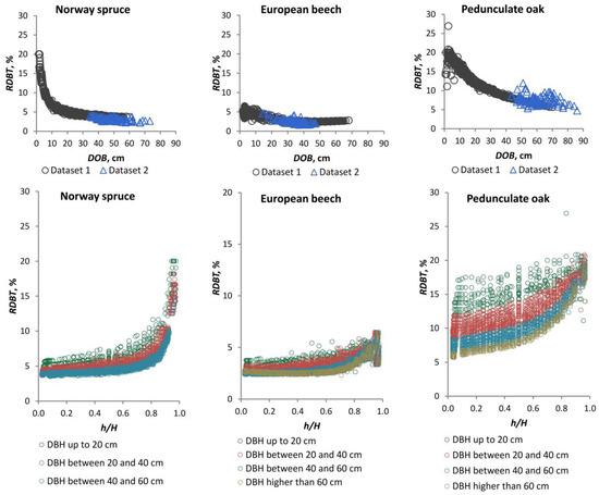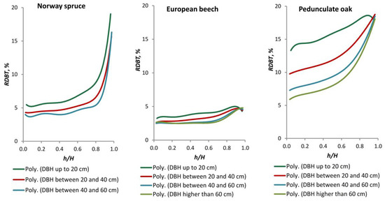 The models displayed in Figure 7 also demonstrate the RDBT dynamics along the stem and the RDBT dynamics as a consequence of increasing diameter at breast height, which can effectively substitute for the time factor. The parameter values and accuracy indexes of these models are presented in Table A1, which can be found in Appendix A. For these models, the R2 value increases from low to high DBH classes for all species analysed. Consequently, the values quantifying the errors, MAE and RMSE, are lowest in the large DBH classes.