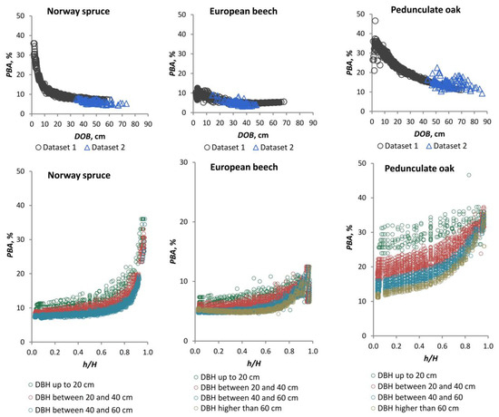Similarly, the values of PBA for the three species under analysis are illustrated in Figure 8, which depicts the variation in PBA versus stem diameter over bark and relative height along the stem. As the size of PBA can be successfully substituted for the values related to the proportion of bark in the volume, the results from the two datasets are of great practical importance. The point cloud of the PBA values has a similar shape to the point cloud of the RDBT size, which is not surprising given that the area formula has diameter as a calculation element. However, there are also notable differences in size and range of variation. A comparison of the results from the two datasets reveals that the degree of overlap between the recent results reflected by dataset 2 and the data describing the national PBA included in dataset 1 is higher for Norway spruce and European beech. In the case of pedunculate oak, the PBA values in dataset 2 are more dispersed. For Norway spruce and pedunculate oak, dataset 2 shows PBA values for diameters greater than 60 cm and greater than 70 cm, respectively. In practice, the tables for estimating double bark thickness and the tables for estimating the proportion of bark in the volume [55], which are valid at the national level, are not applicable for diameters exceeding the aforementioned limits. Similarly, in the case of PBA, as in the case of RDBT, there is a decrease in the PBA values with increasing DOB values, with a specific variation and dynamics observed for each species analysed. The lowest PBA values in dataset 1 are observed in the European beech species, with a range of variation between 4.54 and 12.49%. In Norway spruce, PBA ranges from 6.89 to 36.00%, while in pedunculate oak, it ranges from 11.10 to 46.60%. A comparative analysis of the PBA values in relation to the relative height along the stem reveals a higher dispersion of the point cloud than in the DOB analysis for all species. The greatest dispersion of the point cloud is observed in the case of the pedunculate oak species. By classifying the data on PBA variation with relative height according to DBH size, it is possible to reduce the dispersion of subsets of values and to identify the variation in PBA along the stem relative to DBH. In all cases, the point cloud spread indicating PBA variation along the stem is superior for data subsets with lower DBH values.