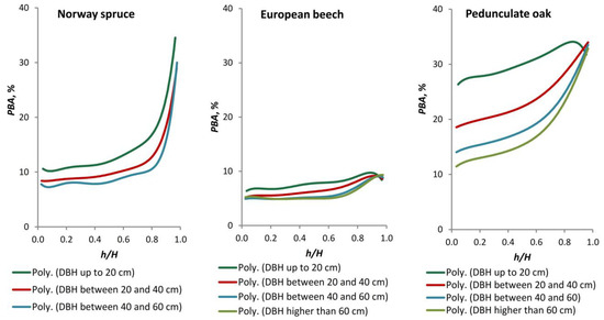 In order to model the variation in PBA in relation to h/H, it was found that the high-degree polynomial was a useful tool, just as it had been in the case of analysing the RDBT data. Figure 9 illustrates the estimation of PBA along the stem as a function of h/H by applying a sixth-degree polynomial function. The shapes of the curves are comparable to those observed in the evolution of RDBT along the stem, with a parallel trend remaining up to a relative height of 0.6. Subsequently, a notable increase in the PBA values towards the top of the stem is evident, with a more accentuated rise in the section with a relative height of between 0.8 and 1.0. The steepest increase is observed in the vicinity of the top of Norway spruce.