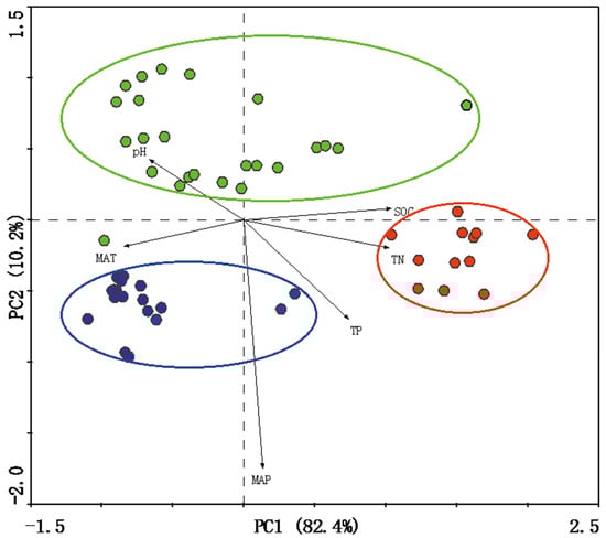 In this study, the climate factors and soil factors of different types of shrublands were all involved in the principal component analysis. The results showed that principal component axes 1 and 2 can explain 92.6% of the total variation in the environmental factors (of which the PC1 axis can explain 82.4% and the PC2 axis can explain 10.2%; see Figure 1). In the PCA, the distribution range of the desert, alpine, and secondary shrublands was clear, indicating that the different types of shrublands had obvious environmental differences. The different types of shrublands were separated by the PC2 axis, which was mainly related to MAP. Meanwhile, the alpine shrublands and secondary shrublands were separated by the PC1 axis as well, which was related to the MAT, SOC, TN, etc., indicating that these environmental factors may be the reasons behind the colonization and growth of different types of shrublands.