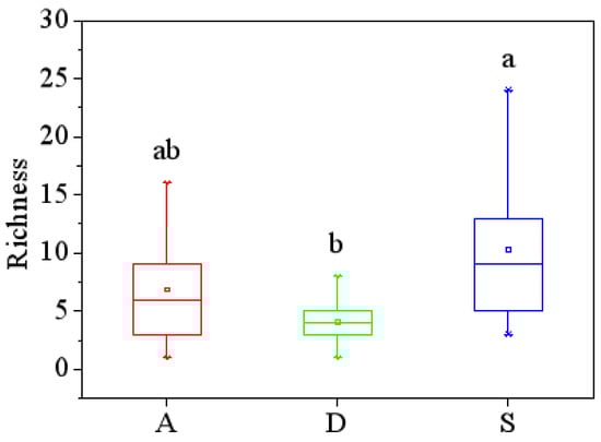 The richness of different types of shrublands. Different letters indicate significant differences. A refers to alpine shrublands, D refers to desert shrublands, and S refers to secondary shrublands.