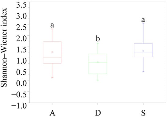 The Shannon–Wiener index of different types of shrublands. Different letters indicate significant differences. A refers to alpine shrublands, D refers to desert shrublands, and S refers to secondary shrublands.