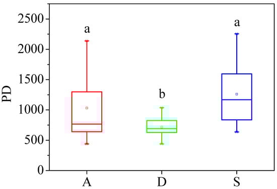 The phylogenetic diversity (PD) of different types of shrublands. Different letters indicate significant differences. A refers to alpine shrublands, D refers to desert shrublands, and S refers to secondary shrublands.