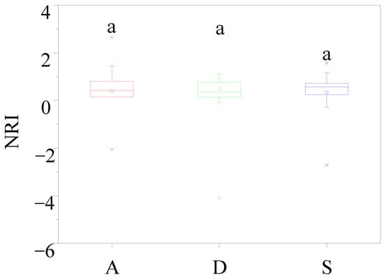 The net relatedness index (NRI) of different types of shrublands. Different letters indicate significant differences. A refers to alpine shrublands, D refers to desert shrublands, and S refers to secondary shrublands.