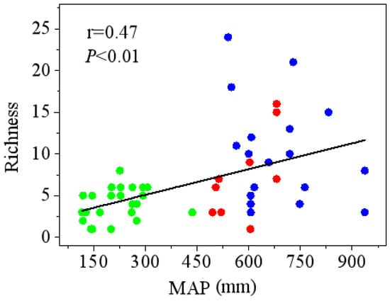 The species richness of shrubland community along mean annual precipitation (MAP) gradient across different types of shrublands. The green circles represent desert shrublands, the red circles represent alpine shrublands, and the blue circles represent secondary shrublands, while the black line represents line fitting.
