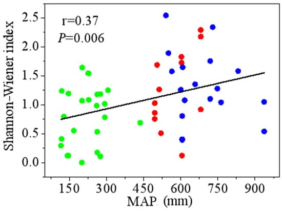 The Shannon–Wiener index of shrubland community along mean annual precipitation (MAP) gradient across different types of shrublands. The green circles represent desert shrublands, the red circles represent alpine shrublands, and the blue circles represent secondary shrublands, while the black line represents line fitting.