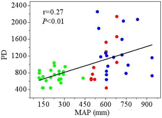 The phylogenetic diversity (PD) of shrubland community along mean annual precipitation (MAP) gradient across different types of shrublands. The green circles represent desert shrublands, the red circles represent alpine shrublands, and the blue circles represent secondary shrublands, while the black line represents line fitting.