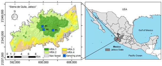 This research was conducted in the natural protected area “Sierra de Quila”, located in west–central Mexico, in the state of Jalisco (Figure 1); the altitude ranges from 1350 to 2540 m asl. “Sierra de Quila” hosts many flora and fauna species that maintain important ecological processes enclosed in 15,192.50 ha [28]. Vegetation is mainly composed of mixed temperate forest with the following species: Pinus douglasiana, Pinus devoniana, Quercus resinosa, and Quercus obtusata. Potential fire regime is characterized by frequent surface fires of low severity [29]. However, a devastating crown fire occurred in 1986, resulting in both forest fighter and ecosystem property losses [30]. The study area is also prone to natural and human disturbances, such as insect outbreaks, firewood production, and timber harvesting. Previous studies have classified the area according to Homogeneous Response Areas (HRAs), where field information collected in situ can be extrapolated to areas with similar characteristics [31].