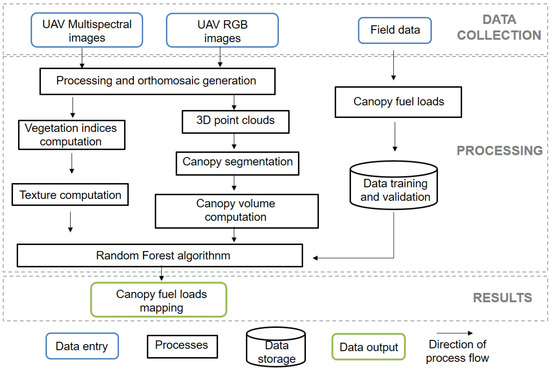 Current advances in data collection equipment, processing techniques, and computing capability enable the development of novel methods for forest fuel management [27]. Moreover, data from diverse remote sensors as UAV high-resolution RGB and multispectral imagery, combined with field measurements and artificial intelligence techniques, are promising elements for appropriate the monitoring and management of forest fuels. Here, we present a novel approach: a cost-effective and easily replicable method which enables the monitoring of CFLs.