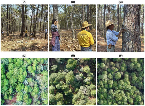 Figure 3. Field measurements and tree canopies overview. (A) Tree diameter measurement. (B) Tree height measurement. (C) Tree tagging. (D) UAV RGB image from plot P1. (E) UAV RGB image from plot P2. (F) UAV RGB image from plot P3.