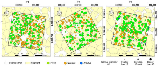 Tree spatial distribution patterns differed among the three plots according to Moran´s Index. Moreover, differences among the plots also occurred in terms of CFLs. Thus, the highest degree of clustering was present in P1, showing the greatest values of CFLs (median value of 16.98 kg/m2). Conversely, the greatest random pattern was observed in P3, presenting the lowest CFL values (median value of 10.71 kg/m2). These differences limit the use of linear and allometric model regression because tree spatial distribution patterns prevent generalizable models from being obtained [89,90]. Other studies have identified that mixed forests tend to present random distributions following a disturbance occurrence and they are reverted to clusters over time [91]; therefore, these may be the cause of differences in the spatial distribution patterns of trees in our study area.