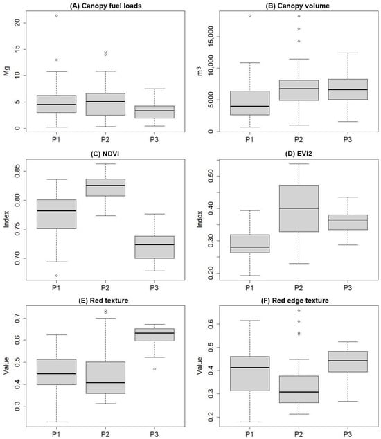 Figure 5. Boxplot showing median and quartiles for Canopy fuel loads (Mg); Canopy volume (m3); Normalized Difference Vegetation Index (NDVI); 2-band Enhanced Vegetation Index (EVI2); Red band texture (Red texture) and Red edge band texture (Red edge texture).