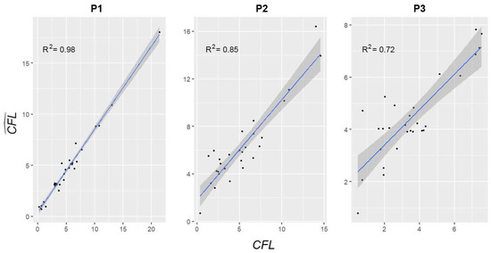 Figure 6. Model verification through linear regression. C F L i = CFL from field measurement and C F L i ^ = CFL estimated by RF model.