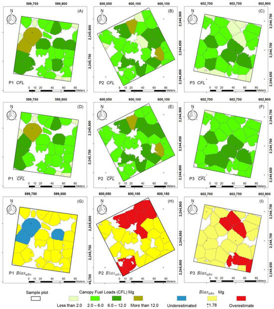 According to validation data, our RF model achieved a strong performance with R2 = 0.75 and RMSE = 1.78 Mg. At the plot level, P1 reached R2 = 0.98, B i a s a b s = −17.12 Mg, and B i a s r e l = 10.63%; P2 yielded R2 = 0.85, B i a s a b s = 28.06 Mg, and B i a s r e l = 19.01%; and P3 offered a performance of R2 = 0.72, B i a s a b s = 25.85 Mg, and B i a s r e l = 26.21%. (Figure 6). Therefore, the modeled CFL per plot was 143.90 Mg, 175.66 Mg, and 124.46 Mg for P1, P2, and P3, respectively (Figure 7D–F).