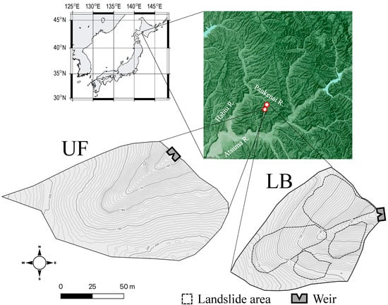 This study was conducted in an upstream area of the Habiu River Basin, which was a headwater part of the Atsuma River Basin in Iburi Subprefecture, northern Japan (42°46′N, 141°58′E; 120–200 m a.s.l.; Figure 1). This region was severely affected by the 2018 Hokkaido Eastern Iburi earthquake []. The underlying bedrock consists of Neogene sedimentary rock. Soils in our study catchments were composed of humus layers (i.e., andosol, 0–0.5 m deep), pyroclastic deposits (i.e., tephra, 0.5–2.0 m deep), and weathered bedrock layers (2.0–2.6 m deep). According to Istiyanti and Goto [], physical properties of these soils were as follows: bulk density of ca. 0.5–1.0 g cm–3, soil particle density of 2.4–2.8 g cm–3, and void ratio of ca. 2–4. The climate is classified as cool temperate [], and the dominant forest vegetation is a mixture of secondary deciduous forest, which consists mainly of Betulaceae and Fagaceae, such as Japanese white birch (Betula platyphylla) and mizunara (Quercus crispula), and coniferous forest, such as Japanese larch (Larix kaempferi) and Sakhalin fir (Abies sachalinensis). The average annual precipitation and air temperature from 1992 to 2021 were 1040 mm y–1 and 7 ℃, respectively [].