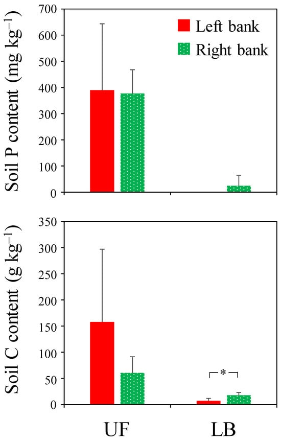 Soil phosphorus (P) and carbon (C) contents on the left and right banks of the undisturbed (UF) and landslide-bearing forest (LB) catchments. Error bars represent standard deviations. An asterisk represents a significant difference in the soil C content between the left and right banks (U-test, p < 0.05).