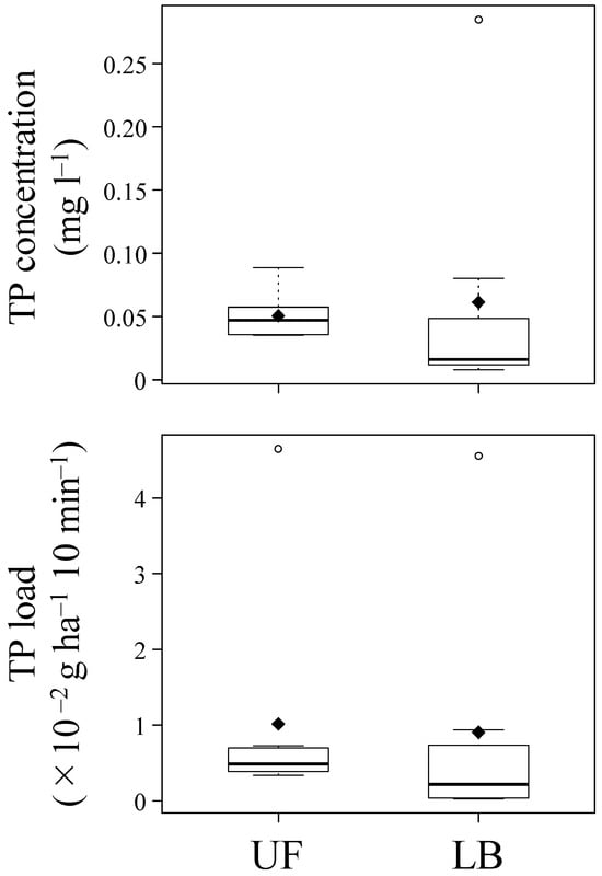 Boxplots for the total phosphorus (TP) concentration and load obtained monthly during the observation period in the undisturbed (UF) and landslide-bearing forest (LB) catchments. Closed diamonds and open circles represent mean and outlier values, respectively. Whiskers represent highest and lowest values within 1.5 times the interquartile range.