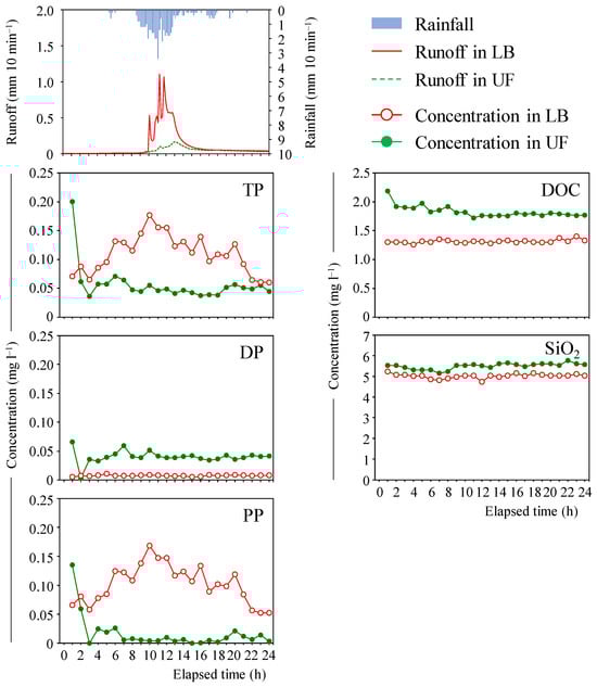 The average TP concentration during the rain event was little different from that during low flows in the UF catchment even though the total rainfall during the rain event was intense (Figure 3 and Figure 5). Higher levels of SiO2 during the rain event in the UF catchment than in the LB catchment (Figure 4) imply that base flow and subsurface flow made a larger contribution to runoff during the rain event in the UF catchment [,,]. This is also supported by the fact that, during the rain event, the maximum peak runoff was much lower and the lag time between the maximum peak rainfall and runoff was longer in the UF catchment than in the LB catchment (Figure 4), indicating that runoff gradually increased in response to rainfall in the UF catchment.