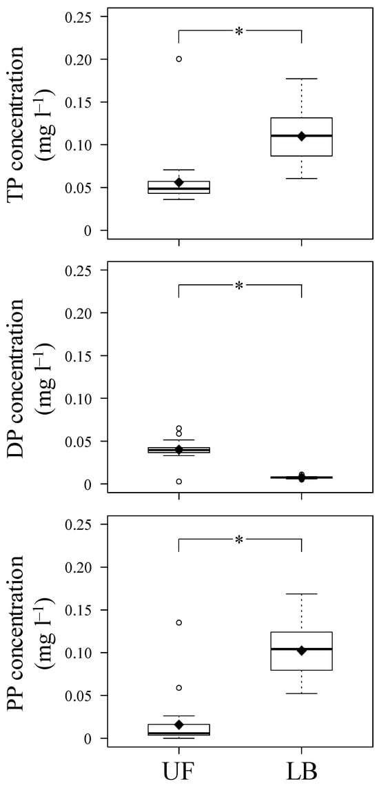 Boxplots for total phosphorus (TP), dissolved phosphorus (DP), and particulate phosphorus (PP) concentrations during a rain event in the undisturbed (UF) and landslide-bearing forest (LB) catchments. Closed diamonds and open circles represent mean and outlier values, respectively. Whiskers represent highest and lowest values within 1.5 times the interquartile range. Asterisks represent significant differences in the concentrations between the two catchments (U-test, p < 0.001).