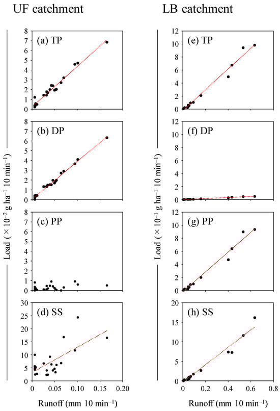 The TP, DP, PP, and SS loads were positively proportional to runoff during the rain event in the UF and LB catchments (Figure 6a,b,d–h). However, the slope of the regression line between the PP load and runoff was not statistically significant in the UF catchment (Figure 6c; test for regression slope, p = 0.054). Similarly, the determination coefficient of the regression line between the load and runoff for SS was smaller than those for TP and DP in the UF catchment.