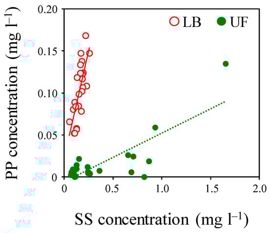 PP concentrations were significantly correlated with SS concentrations during the rain event in the UF and LB catchments (t-test, p < 0.001; Figure 7). The slope of the regression line between the PP and SS concentrations was significantly larger in the LB catchment than in the UF catchment (test of homogeneity of regression, p < 0.001). This represented the larger PP-to-SS ratio in the LB catchment than in the UF catchment. Based on the slopes of the regression lines (Figure 7), approximately 51% and 6% of SS, on average, were made up of PP in the LB and UF catchments, respectively.