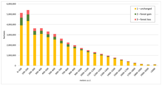 - Hungary: the forest gain is high (8%), especially between 100 and 300 m a.s.l., where it reaches 11%;