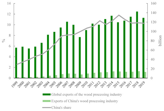 Among the four main raw materials (namely wood, steel, cement, and plastic) used for production, wood is the only biodegradable, renewable, and recyclable material. Wood processing products can substitute some high carbon emission materials, thus contributing significantly to climate change mitigation. Due to the low labor cost and huge domestic market, China has gradually developed a complete industrial chain, consequently taking an essential position in the global wood products market [1]. However, China has experienced a decrease in the provision of wooden products to the global market in recent years. According to the United Nations Commodity Trade Statistics Database (UN Comtrade) and the China Forestry and Grassland Statistical Yearbook, China’s economy developed rapidly after entering the World Trade Organization (WTO), and the share of China’s wood-processing industry exports to the global wood-processing industry exports has been rising. According to Figure 1, only 4.42% of the global market was represented internationally in 2001. China ranked first in the world in terms of its worldwide market share in 2006, which was double that of 2001 at 8.79%. According to a report by the United Nations Food and Agriculture Organization (FAO), the global market for wood processing products was stifled from 2007 to 2008 as a result of the financial crisis, and China’s exports of wood processing products also decreased during this time. However, China’s share of global exports of this sector is still growing. China’s export share increased from 9.93% in 2009 to 11.61% in 2012 because of the industry’s economic recovery following the financial crisis [2], surpassing the export shares of other nations in the world with a total value of 14.122 billion US dollars. China’s foreign market share increased threefold from 2001 to 2015, reaching 13.47%. However, the slowdown in global economic development after 2015 forced products from Southeast Asian nations to compete in the global market at low prices, which had a significant negative effect on China’s exports of wood processing products. With the decline in China’s foreign market share, the growth rate of the industry’s total exports for wood processing in China shifted from positive to negative. Therefore, it is critical to discover strategies to encourage the expansion of China’s wood-processing industry and export growth.