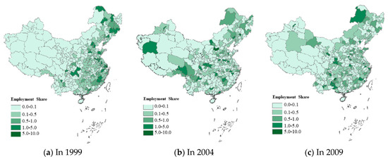 Spatial distribution of China’s wood-processing industry in 1999, 2004 and 2009. Note: The data in the figure are calculated according to the proportion of employment in the wood-processing industry in each city to the employment in China. The color is divided into five shades. The darker the color, the higher the proportion. Data Source: China Industrial Enterprise Database.