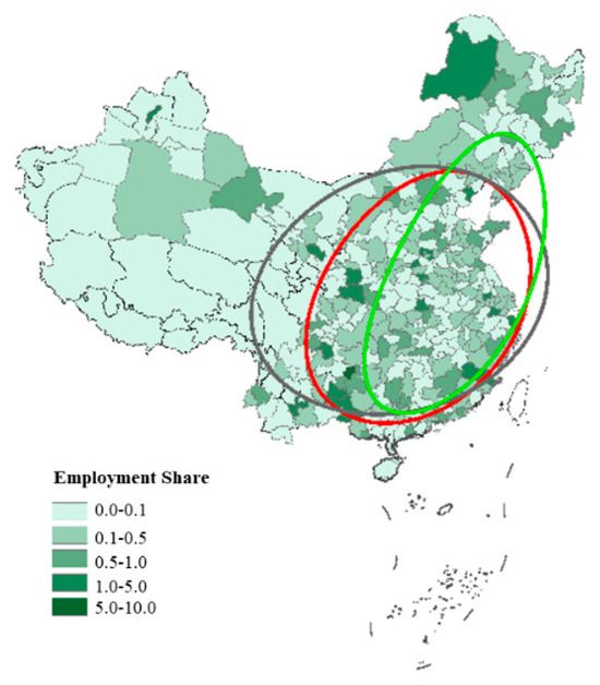 Figure 3 depicts the standard deviation ellipses of China’s urban system and China’s wood-processing industry. We use the standard deviation ellipse of China’s urban system as the control group, which is represented by a black-gray ellipse. The standard deviation ellipse of China’s wood-processing industry in 1999 is presented in green; the standard deviation ellipse for 2009 is red. It can be clearly seen from Figure 3 that compared with China’s urban system, China’s wood-processing industry in 1999 and 2009 has the characteristics of spatial agglomeration. As a control group, the center of gravity for China’s urban system is located at 33.08 N and 111.54 E, namely Xichuan in Henan Province. In 1999, the center of gravity for China’s wood-processing industry was centered at 33.82 N and 117.29 E, which is located in Suzhou in Anhui Province. Clearly, the northeastern cities had a greater agglomeration of China’s wood-processing industry in 1999. In 2009, the center of gravity of the standard deviation ellipse of China’s wood-processing industry was centered at 32.41 N and 113.71 E, which is located in Zhumadian in Henan Province. The results show that the agglomeration center moved from the northeast to the eastern coastal cities compared with 1999. The possible reason is that since half of China’s wood material supply comes from imports, joining the WTO further amplifies the port advantages of the eastern coastal areas. In 1999, the long axis was 12.49, and the short axis was 6.01. In 2009, the long axis was 11.66, and the short axis was 8.29. The long axis in 2009 contracted compared with 1999, while the short axis expanded. As a result, the north–south distribution of China’s wood-processing industry was more concentrated than the east–west distribution, and the spatial agglomeration holds significant potential for improvement.