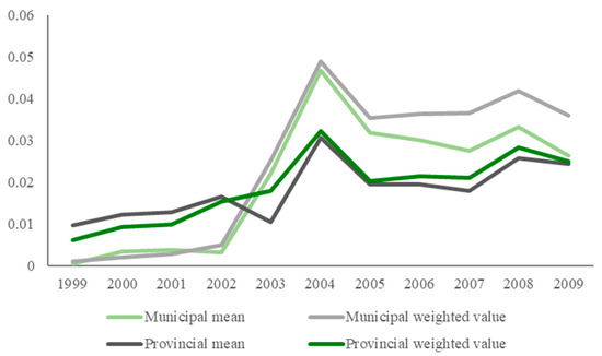 Figure 4 discloses the average of the index γ of the spatial agglomeration of China’s wood-processing industry and the weighted average value weighted by the proportion of employment. First, the spatial agglomeration index rose rapidly from 1999 to 2004, indicating that China’s wood-processing enterprises became more agglomerated from 1999 to 2004. After 2004, the spatial agglomeration index stopped increasing and began to fluctuate around a higher level, or even began to decline. Second, Figure 4 shows that the weighted average weighted by the proportion of employment is basically greater than the average since 2004, which indicates that the industries with a high spatial agglomeration index have a relatively large overall scale and a high share in China’s wood-processing industry after 2004.