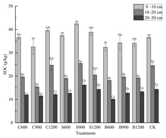 SOC decreased significantly (Figure 2, p < 0.05) with increasing soil depth. In the 0–10 and 10–20 cm soil layers, the S900 treatment resulted in the highest SOC. However, in the 20–40 cm soil layer, SOC did not differ significantly among the different fertilization treatments (Figure 2, p > 0.05).