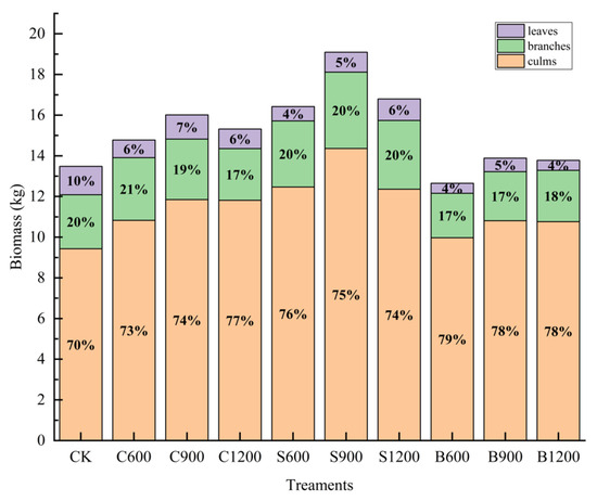 Regarding total individual bamboo stands biomass, the plots under the spreading fertilization treatment method showed an overall higher biomass than that of CK with the peak occurring in the S900 treatment. Compared with CK, the S900 treatment increased the biomass per plant by 4.12 kg and increased the proportion of culm per plant by 5%. Under different fertilization treatments, the biomass allocation patterns showed a trend of increased culm proportions and decreased branch and leaf proportions compared with those of CK (Figure 4).