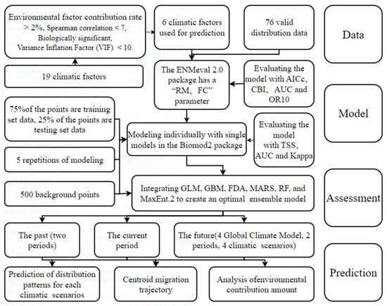 In this study, following the standard protocol for species distribution models (SDMs), we established the ODMAP (Overview, Data, Model, Assessment and Prediction) and the ecological niche simulation workflow diagram [,]. The methodology for constructing and analyzing SDMs encompasses five integral components: an Overview of the research context and objectives, Data acquisition and preprocessing, Model development and selection, Assessment of model performance and validity, and Prediction of species distributions. This paper rigorously details the ecological niche simulation workflow (Figure 1) to ensure the research’s transparency, reproducibility, and facilitation of a rigorous peer review and expert appraisal of the model’s robustness and accuracy.