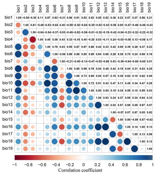 Correlation coefficients between the environmental factors across the distribution ranges of L. pinceana. The blue color in the upper right section indicates positive correlation between the variables, while the red color is used to represent negative correlation. A deeper color, higher saturation, and larger bubble size collectively signify a more significant correlation between the variables; the lower left part shows the correlation coefficient. See Table 1 for the bio1–bio19.