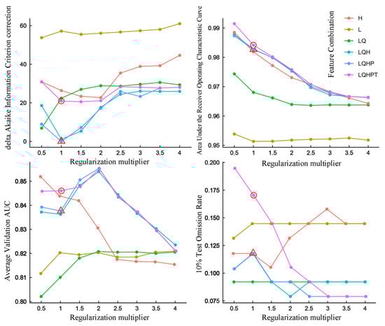 Evaluation results of the MaxEnt model under 48 parameter combinations. The red circles below represent the evaluation results of the MaxEnt model using default parameters, and the red triangles represent the results with delta.AICc = 0. L, Q, H, P, and T are the five features of the MaxEnt model, representing linear, quadratic, hinge, product, and threshold types, respectively.
