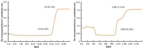 We employed the OEM to predict the current climate scenario and projected the results onto new scenarios to simulate past and future suitable conditions for L. pinceana, generating species distribution probability data. Utilizing the principle of maximizing the TSS, the threshold of maximum training sensitivity plus specificity was deemed the most accurate prediction method [,]. Therefore, we maximized TSS in the Biomod2 to create binary maps, converting the probability maps predicted by the OEM model into binary species distribution grid maps based on the threshold (AUC > 0.8). We used the ‘bm_PlotResponseCurves’ command to output response curve results for significant environmental factors and the ‘writeRaster’ command to produce grid files of suitable species distribution areas and binary maps of suitable/non-suitable habitats. Finally, we imported the suitability grid files into ArcGIS 10.4 and performed a normalization process on the grid values. Then, using the reclassification tool, we manually divided the suitability into four categories: no suitability (grid value = 0), low suitability (0 < grid value ≤ 0.4), medium suitability (0.4 < grid value ≤ 0.6), and high suitability (0.6 < grid value ≤ 1) []. These steps enabled us to obtain predictive maps of habitat distribution for different suitability levels. The binary maps were then used in the SDM toolbox v2.5 with the MaxEnt Tools plugin to calculate areas of contraction, expansion, and stability under different climatic scenarios, as well as centroid changes []. Finally, the analysis tools in ArcGIS 10.4 were used to calculate the centroid distance of suitable areas.
