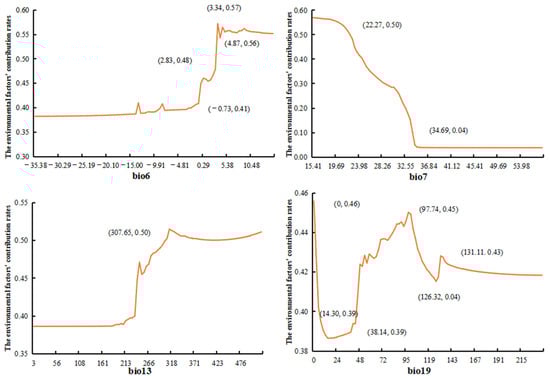 The temperature annual range (bio7), the minimum temperature of the coldest month (bio6), and the precipitation of the wettest month (bio13) are the dominant climatic factors affecting the distribution of L. pinceana, with bio7 having the most significant impact. Research by Ma et al. [] comparing the effects of climatic, topographic, and soil environmental factors on the distribution patterns of major tree species in Southwest China found that thermohydrodynamic conditions are the dominant environmental factors affecting richness patterns, with a more pronounced response to temperature. The geographic distribution of plants at a regional scale is primarily influenced by climate, especially thermohydric conditions, as numerous studies in the Himalayan region have shown that temperature plays a vital role in determining the habitat distribution of species [,,]. L. pinceana, a characteristic plant to Southwest China, predominantly inhabits warm and humid areas, explaining its strong response to temperature and precipitation.