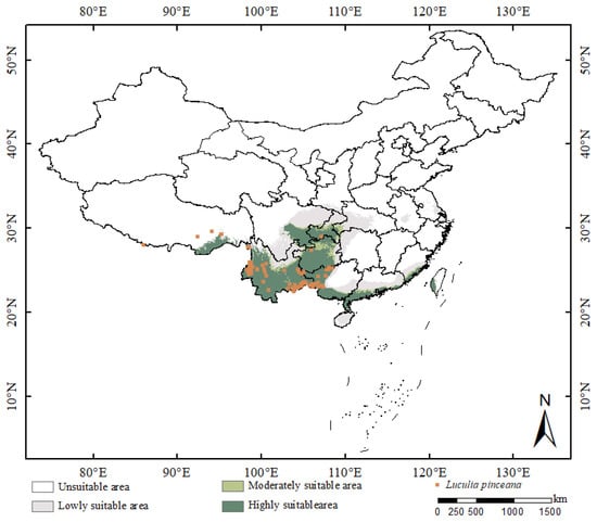 In this study, we utilized 76 natural distribution points and six environmental variables to establish a detailed species distribution prediction process for Luculia pinceana Hook. f. Our aim was to explore the potential distribution patterns of L. pinceana since the Last Glacial Maximum (LGM) and its response to climate change, providing a scientific basis for conservation strategies and the suitable introduction of its wild populations. This model enabled the prediction of L. pinceana’s geographical distribution patterns across five temporal phases: the LGM, the Mid-Holocene (MH), the present, and two future scenarios. Additionally, the model pinpointed the dominant environmental factors influencing these distribution patterns. The results indicate the following: (1) The temperature annual range (bio7), the minimum temperature of the coldest month (bio6), and the precipitation of the wettest month (bio13) are the dominant environmental factors that determine the distribution of L. pinceana. In areas where bio7 is less than 22.27 °C, bio6 is above 3.34 °C, and bio13 exceeds 307.65 mm, the suitability for L. pinceana is highest. (2) Under the current climatic conditions, the highly suitable area of L. pinceana accounts for 64 × 104 km2, which accounts for half of the total suitable area. The suitable habitats for L. pinceana are concentrated in Yunnan, Guizhou, Sichuan, Chongqing, Guangxi, southern Nyingchi in Tibet, and the coastal areas of South China. (3) During the LGM and the MH, the suitable habitats for L. pinceana were essentially consistent with the current scenarios, with no significant southward shift in distribution. This lack of a major southward migration during the LGM could be attributed to the species finding refuge in situ in mountainous areas. (4) Under various future emission scenarios, the suitable habitat area for L. pinceana is expected to experience significant expansion, generally shifting towards the northwest and higher latitudes. The anticipated global warming in the future is likely to provide more favorable conditions for the survival of L. pinceana. It is recommended that the introduction follows the direction of centroid migration, facilitated by vegetation management, and it has the ecological and economic benefits of L. pinceana to a greater extent.