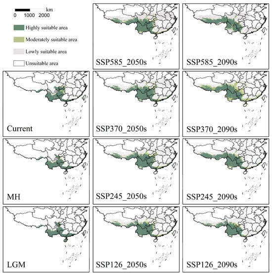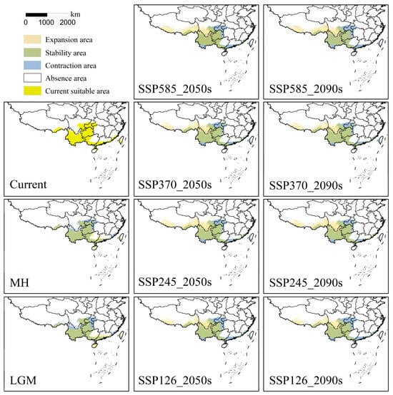 Under the current climatic scenario, the total suitable area for L. pinceana in China was estimated to be 128 × 104 km2, with a highly suitable area spanning 64 × 104 km2, primarily in most regions of Yunnan and Guizhou provinces, and the western part of Guangxi Zhuang Autonomous Region. Additionally, southwestern Sichuan Province, southern Chongqing, and the southern border of Linzhi in the Tibet Autonomous Region also constituted the medium and highly suitable areas. The coastal areas of southern China, along with Hainan and Taiwan provinces, were also identified as suitable for L. pinceana (Figure 5). The potential distribution areas during the LGM and the MH periods were largely consistent with the current distribution pattern, with L. pinceana’s suitable habitats predominantly stable in Southwest China. However, under paleoclimate conditions, the eastern coastal areas showed a more extensive and higher suitability, with most of Hainan province being highly suitable for L. pinceana during the LGM (Figure 6). The net change in the suitable area for L. pinceana from the MH to the present indicated a decrease of 13%, with the total suitable area reducing by 16 × 104 km2. The change from the LGM to the MH was even less (Figure 7), primarily shifting towards the northwest (Figure 7, Figure 8 and Figure 9). By the end of this century, although the climate will continue to change L. pinceana’s suitable patterns, two regions will consistently remain highly suitable: The first is in northwestern Yunnan, including Dali Bai Autonomous Prefecture, Nujiang Lisu Autonomous Prefecture, Baoshan City, Dehong Dai and Jingpo Autonomous Prefecture, the western part of Lijiang City, and the southern part of Diqing Tibetan Autonomous Prefecture. The second is the contiguous area where Yunnan, Guizhou, and Guangxi meet, including Qujing City, Kunming City, Yuxi City, Wenshan Zhuang and Miao Autonomous Prefecture; the eastern part of Honghe Hani and Yi Autonomous Prefecture in Yunnan Province, Liupanshui City, Anshun City, Bijie City, Guiyang City, Qianxinan Buyei and Miao Autonomous Prefecture; and the western part of Qiannan Buyei and Miao Autonomous Prefecture in Guizhou Province, as well as Baise City and the northwestern part of Hechi City in Guangxi Zhuang Autonomous Region (Figure 6).