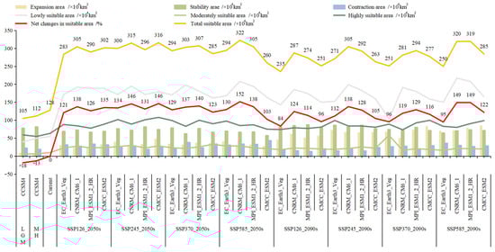 Figure 7 depicts the changes in the suitable area for L. pinceana as predicted by four Global Climate Models (GCMs). The results of L. pinceana’s suitable areas under different future climate scenarios show slight differences but generally fluctuate within a narrow range. Among these, the EC-Earth3-Veg and CMCC-ESM2 models produce more conservative results, while the CNRM-CM6-1 and MPI-ESM1-2-HR models predict larger suitable areas. From the LGM to the year 2100 (LGM–MH–Current–2050s–2090s), the overall suitable area of L. pinceana tends to migrate towards higher altitudes and latitudes (Figure 6), exhibiting a trend of ‘stability-expansion-expansion-contraction’ (Figure 7). Under the predictions of the four GCMs, two time periods, and four shared socioeconomic pathways, the total suitable area of L. pinceana is estimated to be between 235 and 322 × 104 km2, with the highly suitable area ranging from 74 to 108 × 104 km2 (Figure 7). The results of all four GCMs indicate a significant increase in the total suitable area of L. pinceana by the 2050s, with the lowly suitable area expanding eastward to encompass the entire South China region as well as the northern parts of Central and East China. Medium- and high-level suitable areas also show an increase compared to the present, with the greatest expansion seen in the lowly suitable area. By the 2090s, there will be a slight contraction in the suitable area of L. pinceana at different suitability levels, with Central and South China no longer being conducive to the growth of L. pinceana (Figure 6 and Figure 7). In the future, the net changes in the suitable area of L. pinceana are all positive, often exceeding one hundred, indicating that the future suitable area will double from the current climatic scenario. Overall, the future climate will be more favorable for the survival of L. pinceana.