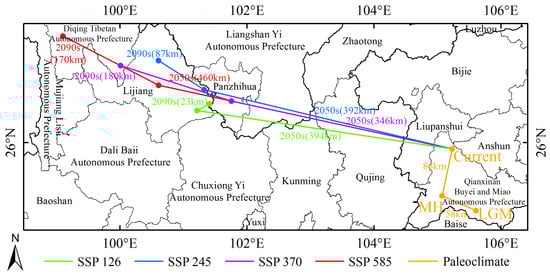 Across four GCMs, the centroids of L. pinceana’s suitable habitat in the 2050s consistently show a northwestward movement towards the junction of Lijiang City and Panzhihua City. By the 2090s, under SSP126, the centroid moves the least and is the only trajectory heading northeast. Under the other three pathways, the centroids continue to move northwest, with the migration distance increasing as the socioeconomic development scenarios become more severe. A comprehensive analysis reveals that with future climatic changes, the centroids of L. pinceana’s suitable habitat tend to move towards higher altitudes and latitudes in the northwest direction (Figure 9).
