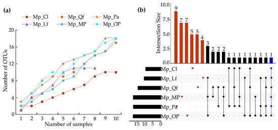Dilution curves (a) and UpSet Venn diagram (b) of Pinus massoniana ectomycorrhizal fungi in different P. massoniana association habitats.