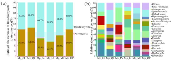 Ratios of Ascomycota to Basidiomycota fungal phyla (a) and relative abundance at the ectomycorrhizal fungal genus level (b) in different Pinus massoniana association habitats.