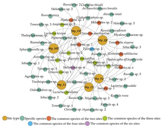 P. massoniana EMF communities showed significant differences in different MpAHs, mainly in terms of their species composition. The number of specific OTUs was significantly higher than that of common species (Figure 3). The common OTU in the six associations was Helotiales sp. 4. The common OTU among the four associations was Tylospora sp. 2. The OTUs of the three associations were Tomentella sp. 2, Helotiales sp. 1, Phialocephala fortinii, Cenococcum sp. 1, Cenococcum sp. 2, Lactarius kesiyae, Russula indocatillus, Amphinema sp. 2, and Lactarius parallelus.
