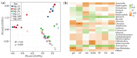 Principal coordinates analysis (PCoA) (a) and Pearson correlation heat map (b) of Pinus massoniana ectomycorrhizal fungal community composition and soil properties. Green is positive, red is negative; the darker color means the correlation is stronger. *: significant at p < 0.05; **: significant at p < 0.01.