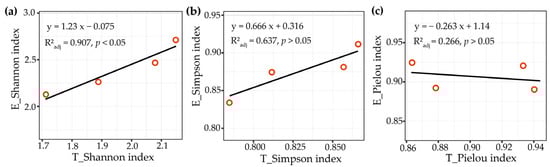 The PCoA clustering map showed an apparent dissimilarity significantly in the EMF communities of different MpAHs (R2 = 0.21, p = 0.001) (Figure 4a). The correlation heatmap indicated that P. massoniana’s EMF community composition was significantly correlated with soil properties (Figure 4b). Tylospora was significantly positively correlated with TP (p < 0.05); Astrosporina was significantly and positively correlated with TP and AK (p < 0.05); unclassified Helotiales was significantly and negatively correlated with pH (p < 0.01); Clavulina was significantly and negatively correlated with AP (p < 0.01); and Sphaerosporella and Oidiodendron were significantly and negatively correlated with SOM (p < 0.05). Linear regression analysis showed that the diversity indices of P. massoniana EMF had a significant positive relationship with the diversity indices of tree species (p < 0.05, for Shannon; p > 0.05, for Simson) but a negative relationship with the evenness index of tree species (p > 0.05, for Pielou) in natural secondary MpAHs (Figure 5).