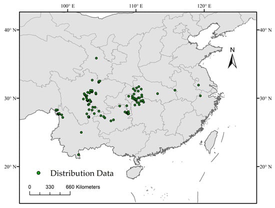 The geographic distribution data of D. involucrata were collected from two approaches, most of which were obtained from the Global Biodiversity Information Facility (GBIF, https://www.gbif.org/ (accessed on 8 September 2023)) and the Chinese Virtual Herbarium (CVH; http://www.cvh.org.cn/ (accessed on 8 September 2023)); the rest were obtained directly from related literature [,,,]. To avoid the effect of spatial autocorrelation caused by the too-close spatial distribution points, after eliminating the duplicate and unclear (without accurate coordinates of latitude and longitude) records [], we used the SDM toolbox (version 2.6) [] in ArcGIS10.2 to ensure that only one distribution record existed within 10 km × 10 km [], which finally gained a total of 130 distribution points (Figure 1). Meanwhile, the species latitude and longitude coordinates of the sample were converted to .csv format in Excel for future use [].