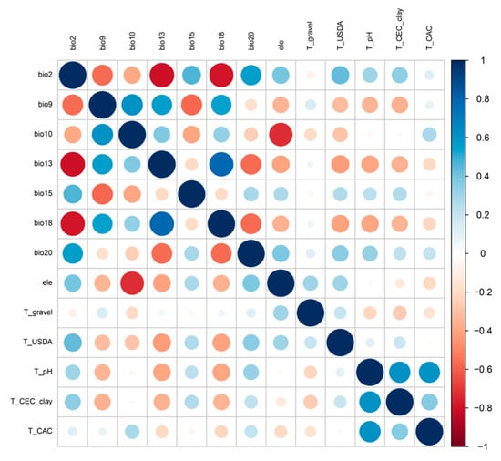 The relevance and integrity of the environmental variables are key factors in building a model [,]. To avoid the collinearity between environmental factors, the variance inflation factor (VIF) was used to eliminate the factors with high correlation coefficients []. The environmental data of each distribution point were sampled and analyzed, with a multiple regression model built in R 4.3.1 by R packages (car and ggplot2). After repeating the VIF calculation 10 times, factors with a VIF of less than 10 were retained; meanwhile, correlation analysis of the environmental factors was performed. The distribution point data and environmental factor data were input into the model for pre-simulation, and the factors whose contribution rate was 0 in the experiment were excluded []. For the variables with a Pearson correlation coefficient |r| > 0.7 (Figure 2) [], factors with higher contributions to the model operation results and greater biological significance were retained to eliminate multicollinearity among the variables. Finally, we obtained 12 environmental variables for the current and future distribution predictions (Table 1).